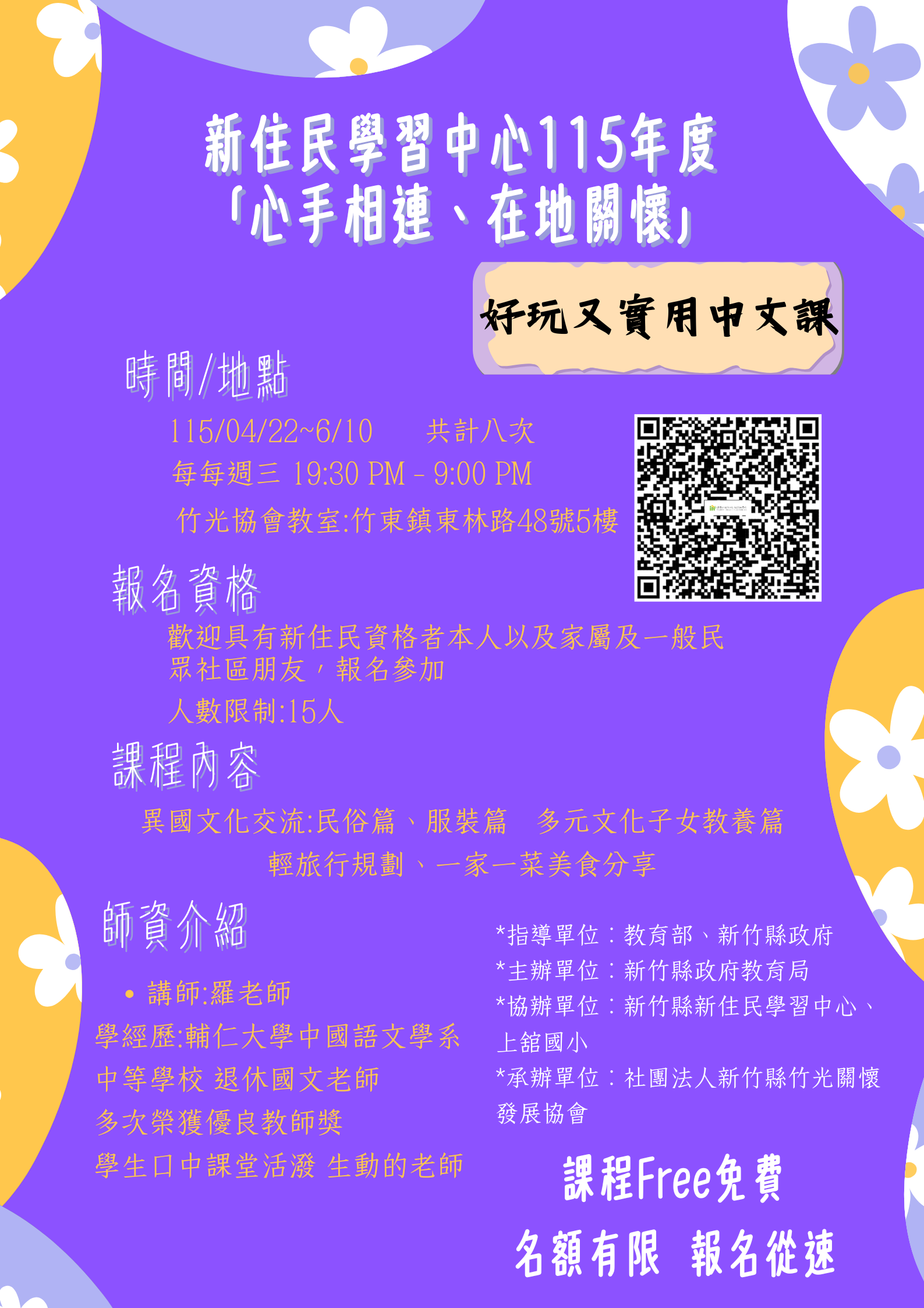 新竹縣新住民學習中心115年度「心手相連、在地關懷」- 好玩又實用中文/情緒成長課程
