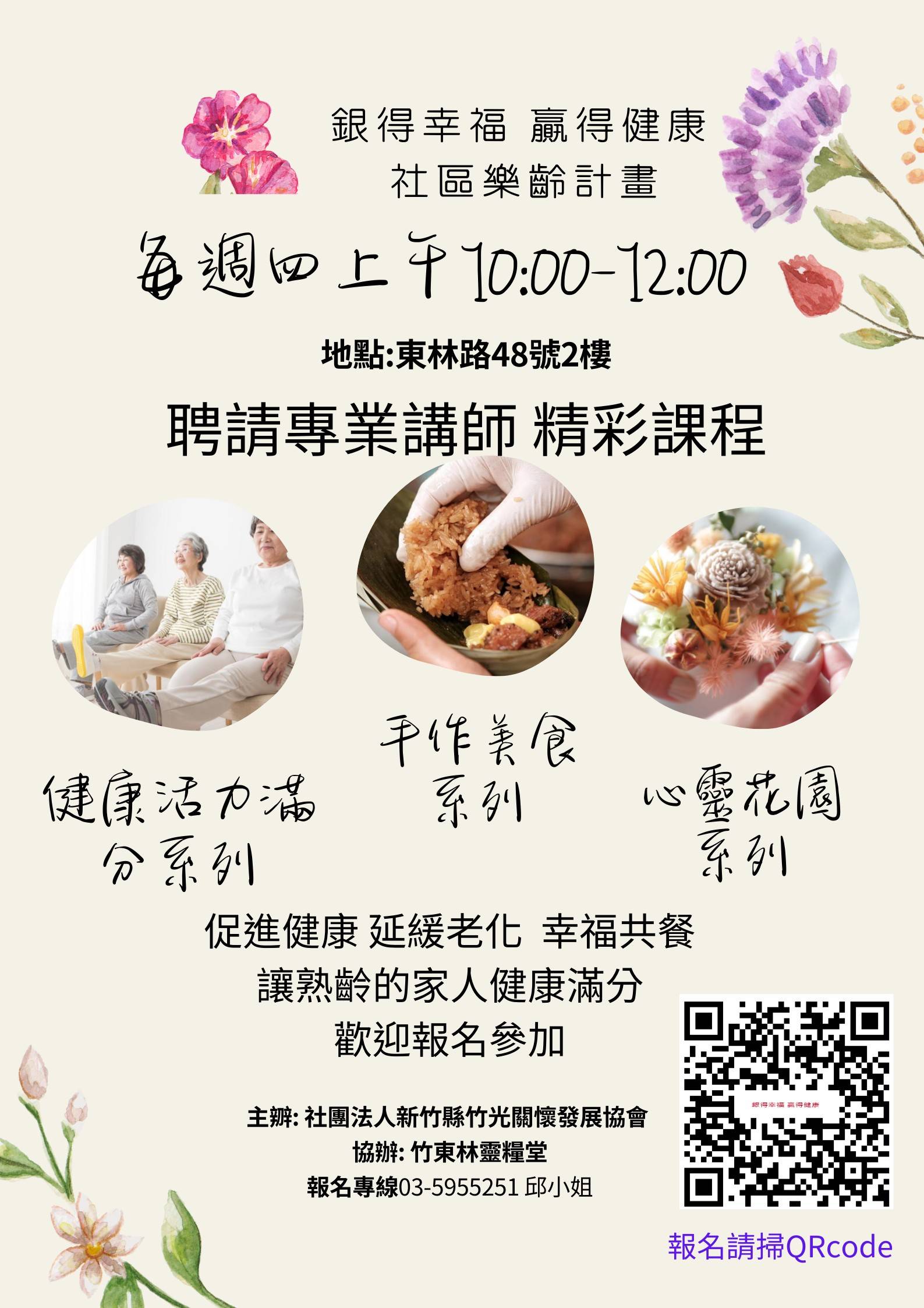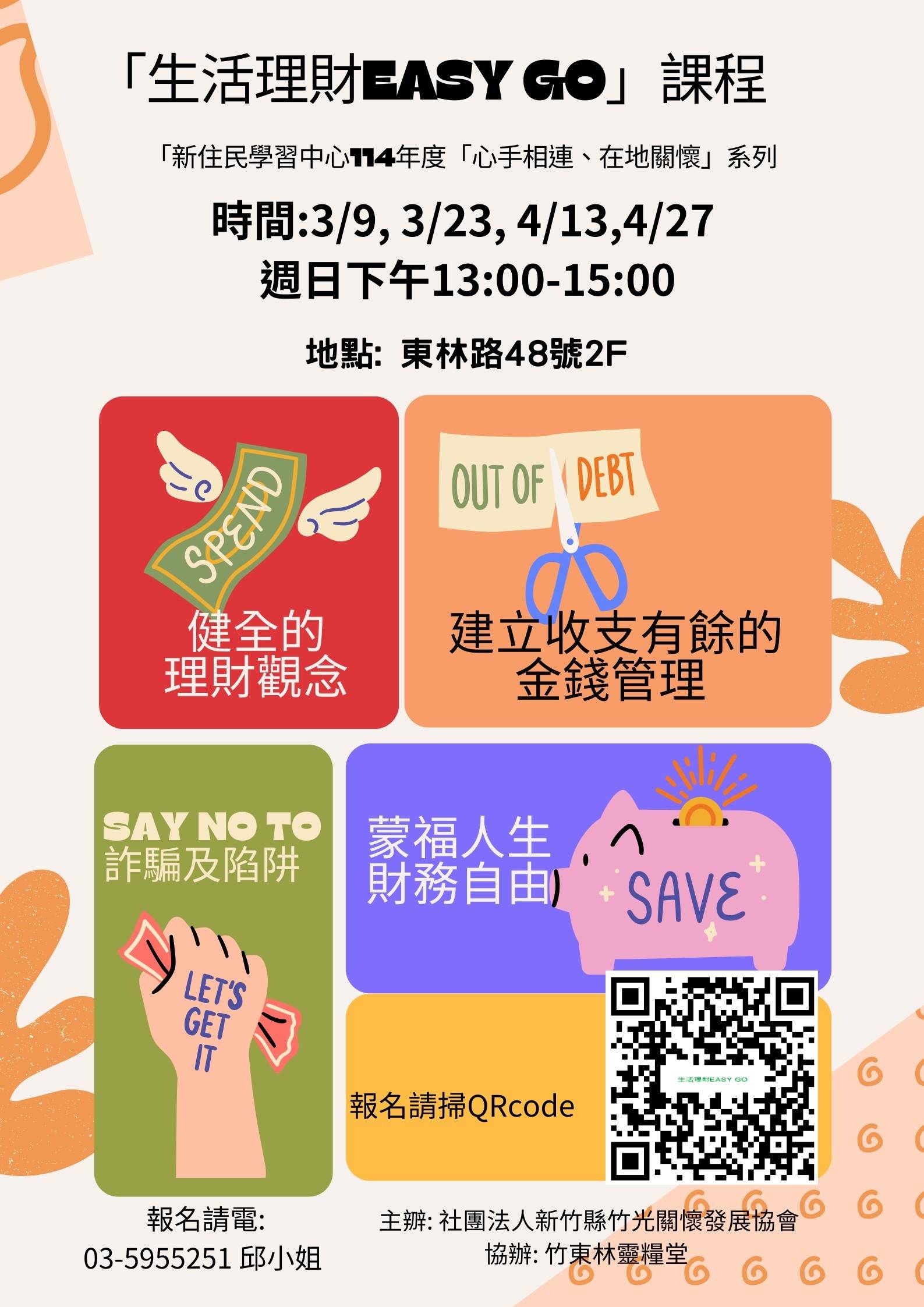 培力永續“培力賦能 永續發展”福利服務是給魚,培力賦能是給漁竿,竹光協會的理念是給魚也要給漁竿, 當被服務的對象及家庭可以透過培力課程及陪伴站立起來,成為幫助別人的領袖,祝福就可以倍增,社區永續發展可以實現。培力課程將不定期推出,協助個人身心靈整全發展,家庭營造及教養職能的提升,特別將針對新住民家庭有系列的課程,歡迎洽詢報名。報名/諮詢專線:03-595-5251 邱小姐 活動紀實 ❤️幸福手作坊❤️ 2025-09-25 原來我們這麼有創造力~~~ 可愛的貓頭鷹,漂亮的水壺袋,芳香又美麗的種子拓香石冰箱貼— 每一次的努…[閱讀全文]人生腳本營會 2025-05-21 5/16-18邀請錢玉芬老師及團隊帶領的人生腳本營會 由竹光協會與竹東靈糧堂聯合舉辦 共有30多位學員參加 學…[閱讀全文] 活動海報 About Me (1)銀得幸福 贏得健康 社區樂齡計畫 (1)「生活理財EASY GO」課程 (1)